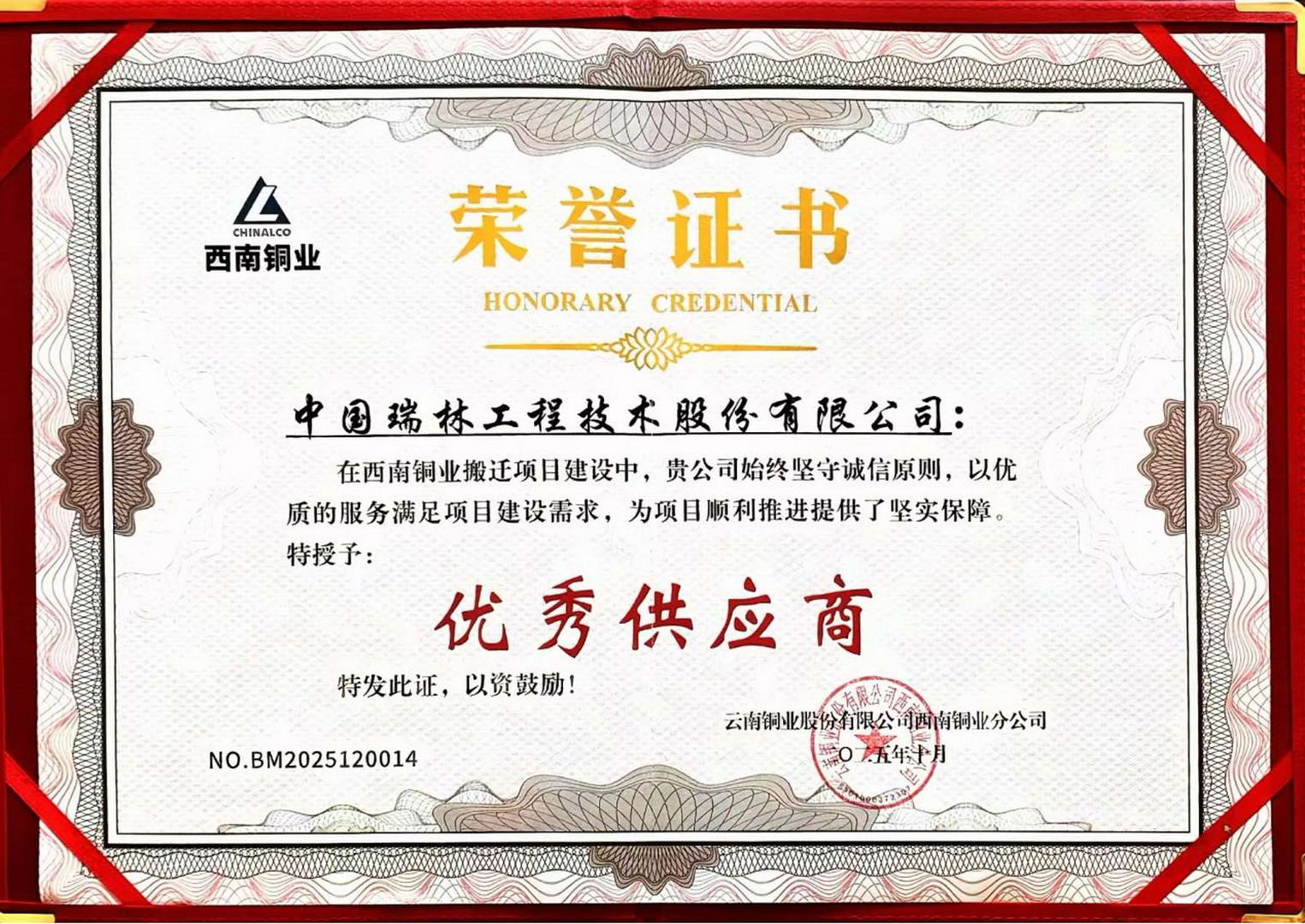 中國瑞林獲評(píng)云南銅業(yè)西南銅業(yè)搬遷項(xiàng)目“優(yōu)秀供應(yīng)商”